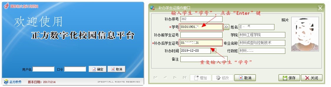 【操作步骤】学生管理1→学生证处理2→补办学生证3→在记录空白处点右键“增加”4→“补办学生证操作窗口”输入“学号”后回车5→填写“补办后学生证号”(输入学号)6→点击“保存”7。