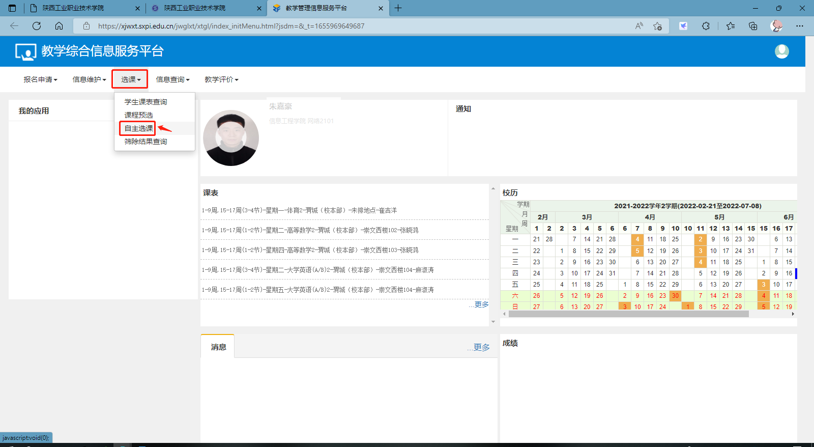 学校主页 → 统一资源门户 → 新教务管理系统 → 选课 → 自主选课