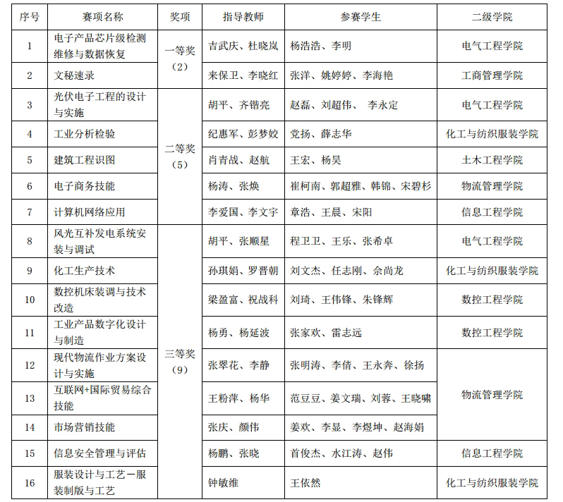截止6月9日,我院23支参赛队代表陕西省参加2017年全国职业院校技能大赛21个赛项角逐已全部结束,在比赛过程中,全体指导教师的精心辅导、扎实培训,全体参赛选手的顽强拼搏、积极应战,取得了一等奖2项、二等奖5项、三等奖9项,总计16项,大赛成绩居陕西高职院校首位。