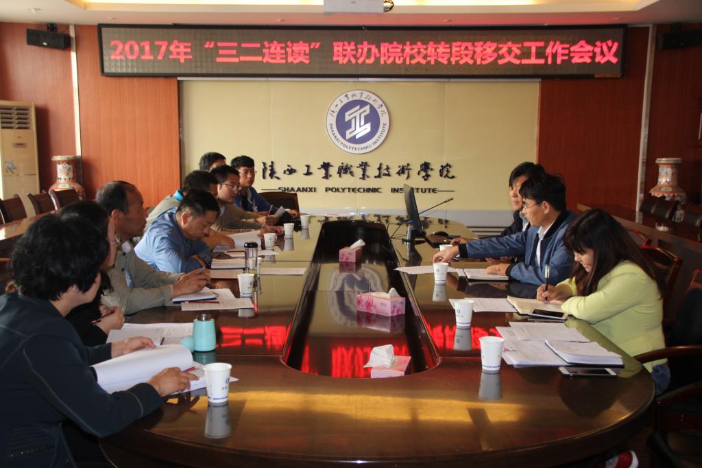 5月5日早上,2017年“三二连读”联办院校转段移交工作会议在崇文楼第一会议室召开,与我院联合开展“三二连读”五年制高职学生培养工作的陕西省理工学校、西北工业学校、靖边县职业教育中心等三所中专(职)学校的分管领导和部门管理人员参加了会议,会议由教务处副处长刘军旭主持。