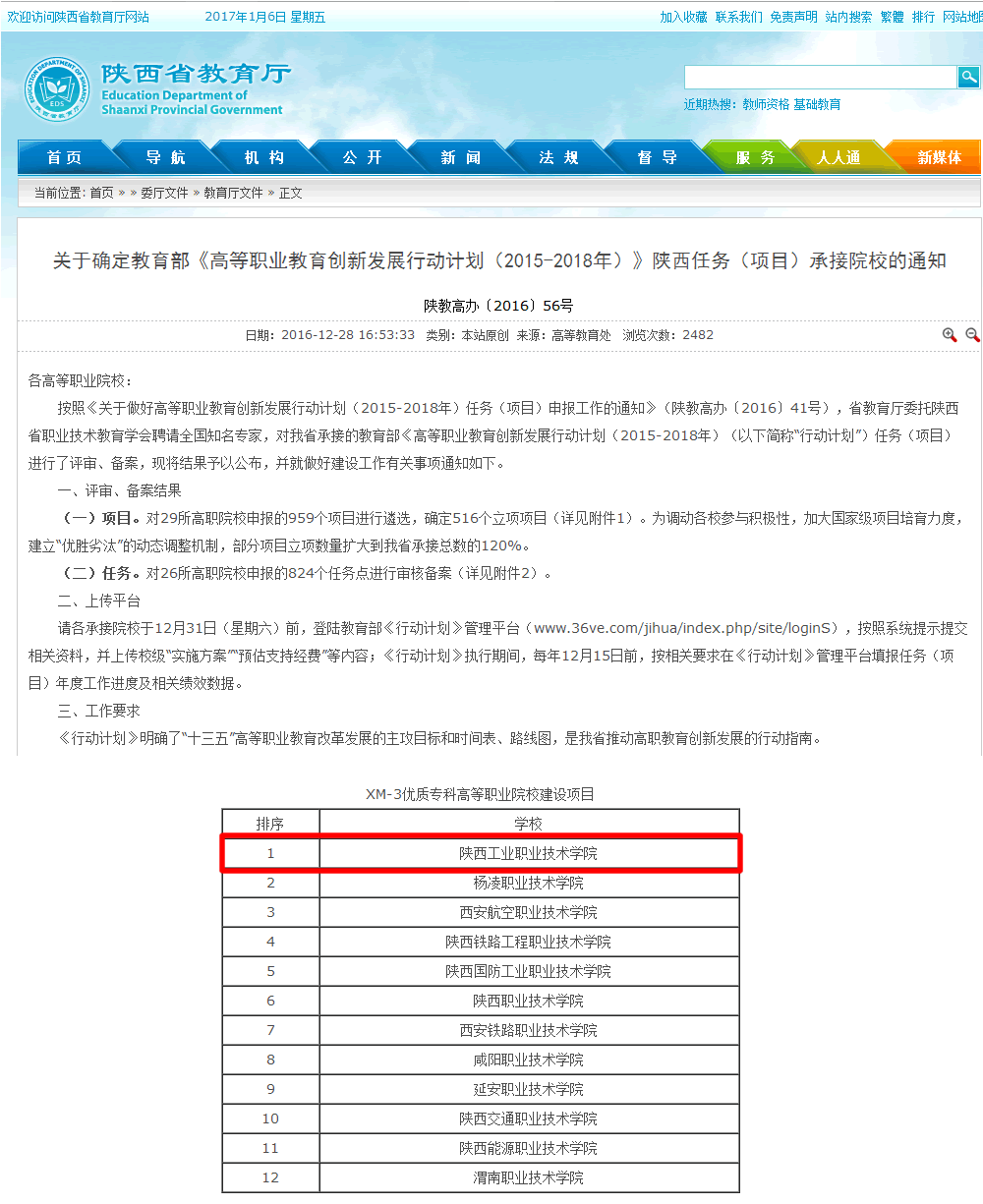 日前,根据陕西省教育厅《关于确定教育部<高等职业教育创新发展行动计划(2015-2018年)>陕西任务(项目)承接院校的通知》(陕教高办〔2016〕56号)文件精神,由我院申报的45个任务,15个项目的62个子项目获批立项。其中,获批立项1个优质高职院校建设项目、18个骨干专业建设项目、8个校企共建生产性实训基地项目、3个国家级职业教育专业教学资源库立项建设项目、1个国家级职业能力培养虚拟仿真实训中心建设项目、3个以市场为导向多方共建应用技术协同创新中心建设项目、3个校企共建以现代学徒制培养为主的特色学院建设项目、9个创新创业教育专门课程建设项目、6个精品在线开放课程建设项目、4个省级以上双师型教师培训基地建设项目、1个国家级骨干职业教育集团立项建设项目、1个全国性机械行业材料成型与控制技术职教集团立项建设项目等,获批项目及任务数居全省首位。