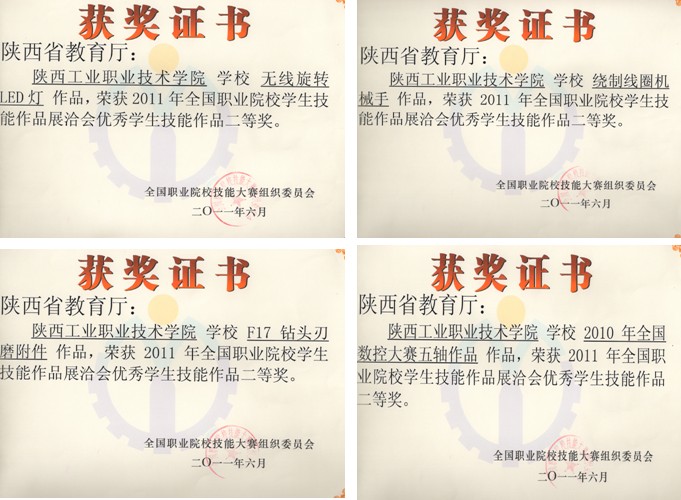 在机械、数控、电气、服装和纺化5个二级学院积极配合下,经过遴选,我院共选送33件作品参展。经过6月23日~26日的3轮展洽会专家组深入现场评分,最终我院的电气工程学院选送的无线旋转LED灯、数控工程学院选送的绕制线圈机械手和2010年全国数控大赛五轴作品、校办工厂选送的F17钻头刃磨附件等4件作品获二等奖,数控工程学院选送的2010年全国数控大赛四轴作品、电气工程学院选送的智能机械手臂和蟋蟀机器人、服装艺术学院选送的烙画、京剧脸谱、烙画-四君子等6件作品获三等奖,其余的23件作品获优秀奖。